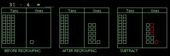 Before Regrouping: 31 = 3 tens + 1 one After Regrouping: 31 = 2 tens + 11 ones Subtract: Take away 4 ones --> 2 tens + 7 ones = 27