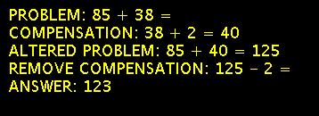 In this example we have 85 + 38. It's a lot easier to add 85 + 40 and so we