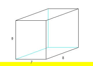 Find the volume of the following box: VOLUME = 9 * 7 * 8 = 504 cubic units
