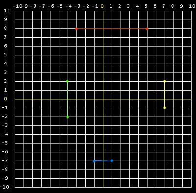 LENGTH OF GREEN LINE SEGMENT: 2 - -2 = 4 LENGTH of YELLOW LINE SEGMENT: 2 - -1 = 3 LENGTH OF BLUE LINE SEGMENT: 1 - -1 = 2 When calculating the length of a line segment always subtract the smaller value from the larger value. |