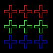 The line below will make a single red plus sign. You need to make nine and the colors need to be as shown below. The starting points that will work are: (-30,30), (0,30), (30,30), (-30,0), (0,0), (30,0), (-30,-30), (0,-30), (30,-30).