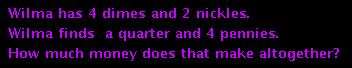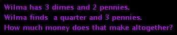 ANSWER: 3 dimes + 2 pennies + 1 quarter + 3 pennies = 30 + 2 + 25 + 3 = 60¢ ANSWER: 4 dimes + 2 nickles + 1 quarter + 4 pennies = 40 + 10 + 25 + 4 = 79¢