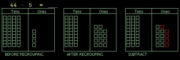 Before Regrouping: 44 = 4 tens + 4 ones After Regrouping: 44 = 3 tens + 14 ones Subtract: Take away 5 ones --> 3 tens + 9 ones = 39