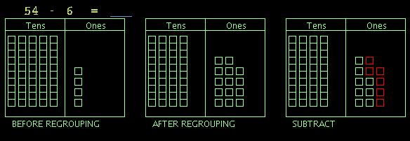 Before Regrouping: 54 = 5 tens + 4 ones After Regrouping: 54 = 4 tens + 14 ones Subtract: Take away 6 ones --> 4 tens + 8 ones = 48
