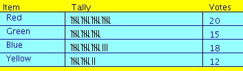 Let's say you want to know what the favorite colors for all the people you know are. You could keep track of this using a tally. Here is one way you could set up your tally. Each mark stands for one vote.