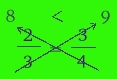 Multiplying the 3 x 3 = 9 and the 2 x 4 = 8, we get our cross-products. You will notice that we wrote the 9 as the answer to 3x3 on the right side and the 8 for 2x4 on the left side. You should also notice the less than sign which is open towards the 9. This test tells us that 3/4 is greater than 2/3. |