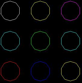 | You can look up the colors for these decagons and you will also have to figure out how to draw them. All I'm going to tell you is where to start them: (-100, -100), (-100, 0), (-100, 100), (0, -100), (0,0), (0, 100), (100, -100), (100, 0), (100, 100). Decagons have 10 sides and the angle at each turn can be figured out by dividing 360 by the number of sides. The sides are all 20 units long. |