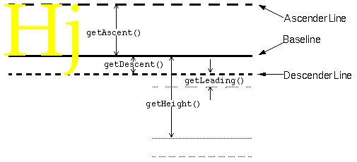 getAscent()method returns the number of pixels between the ascender line and the baseline. Generally, the ascender line represents the typical height of capital letters. Specifically, the ascent and descent values are chosen by the font's designer to represent the correct text "color", or density of ink, so that the text appears as the designer planned it. The ascent typically provides enough room for almost all of the characters in the font, except perhaps for accents on capital letters. ThegetMaxAscent()method accounts for these exceptionally tall characters.getDescent(),getMaxDescent()- The